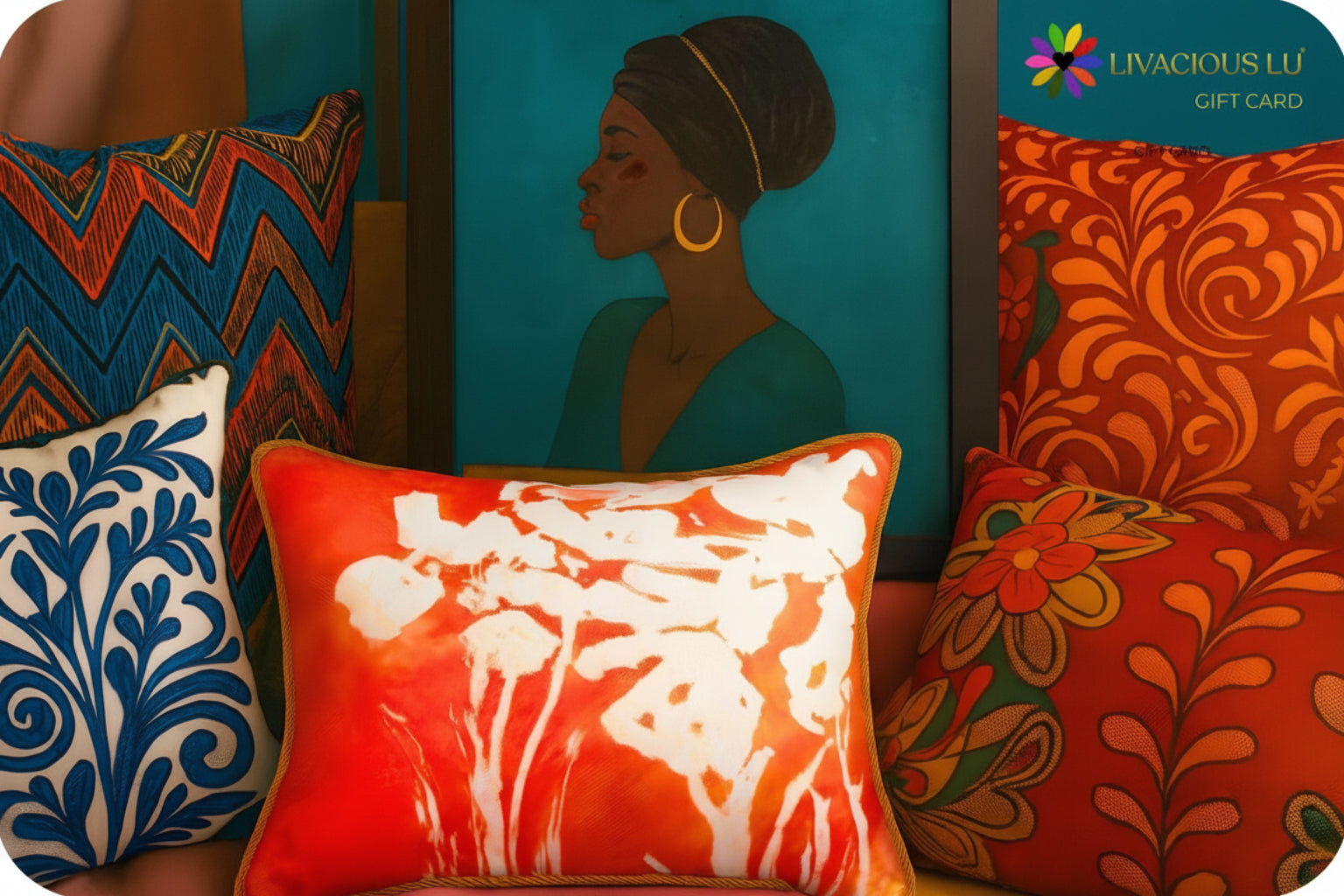 When you want to send something beautiful and meaningful but are not sure which piece they will love most, a LIVACIOUS LU® Gift Card makes it easy. It lets them choose the art, pillows, or home accents that speak to their spirit and feel like home.